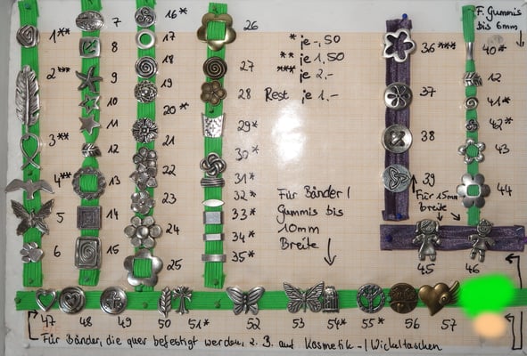 Das nachfolgende Foto zeigt unsere vorrätigen Metallschiebeperlen, die "aufgefädelt" werden, z.B. an einem Gummiband bei Gotteslobeinbänden oder auf den Webbändern an Kosmetiktaschen.