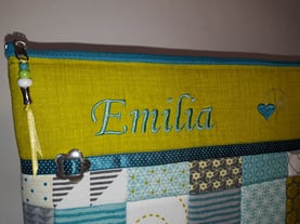 Beispiel für Befestigung am Webband der Kosmetiktasche. Dieses Motiv könnte man natürlich genauso gut hochkant auf einen Gummi fädeln, aber bei gewissen Motiven sieht es eben nicht so gut aus, wenn sie um 90 Grad gedreht sind.